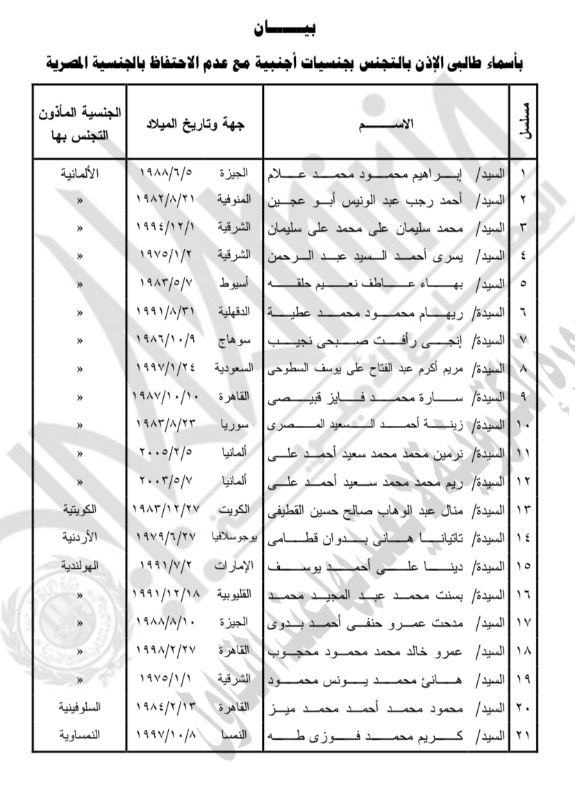 أصدر اللواء محمود توفيق، وزير الداخلية، القرار الوزاري رقم 1673 لسنة 2022، والمتضمن الإذن لـ21 مواطنا بالتجنس بجنسيات أجنبية مع عدم الاحتفاظ بالجنسية المصرية.
