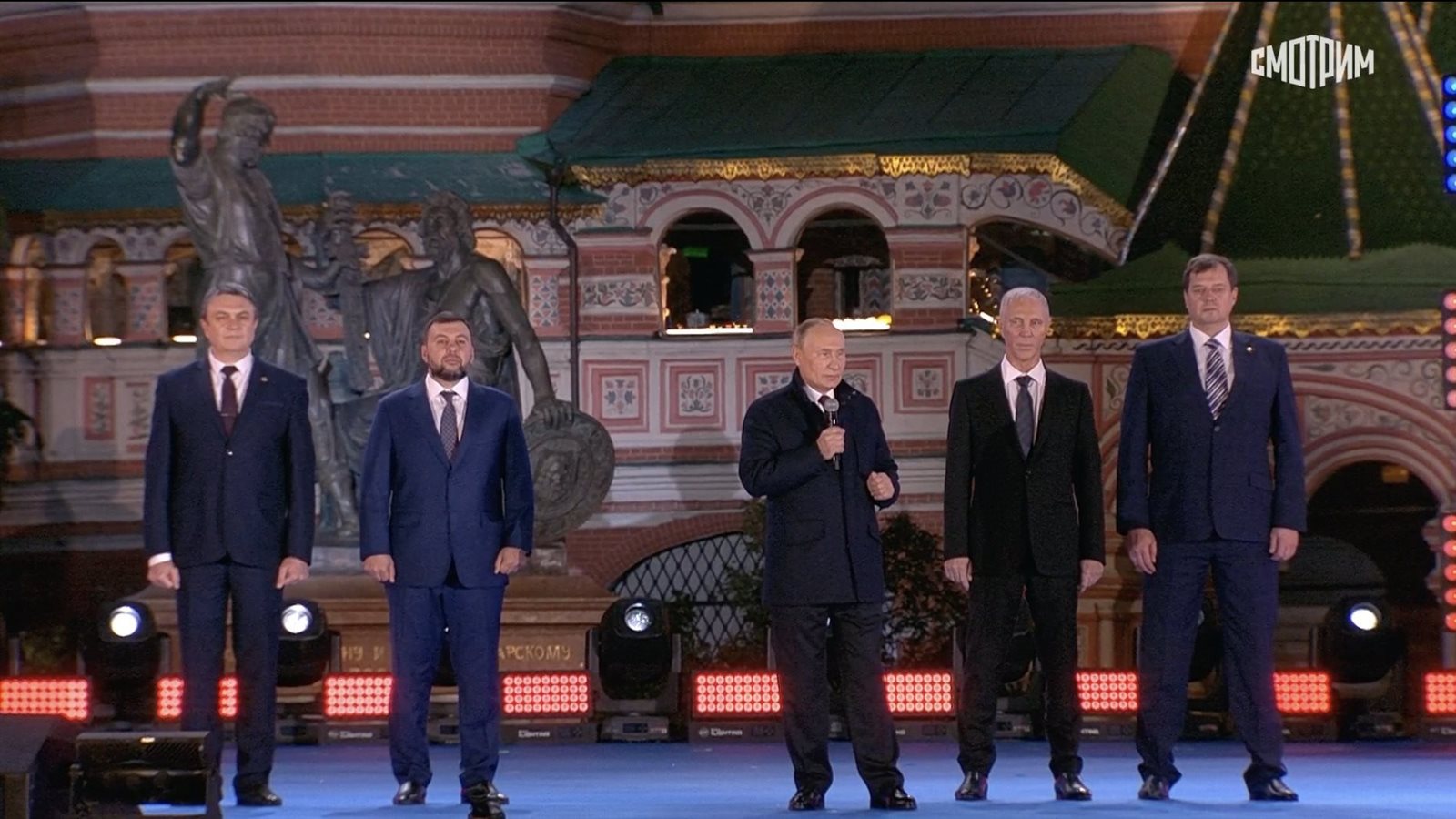 ووقع بوتين إلى جانبه وقادة دونيتسك ولوجانسك وزابوريجيا وخيرسون، مراسيم الانضمام إلى روسيا الاتحادية، مؤكدا "سنقوم بكل ما في وسعنا لدعم أشقائنا.. مرحبا بكم في وطنكم".