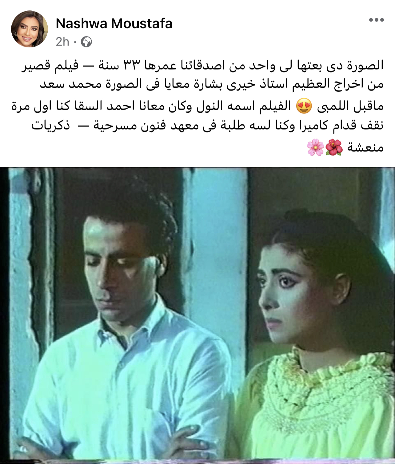 وعلقت نشوي مصطفي علي الصورة، كاتبة: “الصورة دى بعتها لى واحد من أصدقائنا عمرها ٣٣ سنة — فيلم قصير من اخراج العظيم استاذ خيرى بشارة معايا فى الصورة محمد سعد ماقبل اللمبى الفيلم اسمه النول وكان معانا احمد السقا كنا اول مرة نقف قدام كاميرا وكنا لسه طلبة فى معهد فنون مسرحية — ذكريات منعشة”.