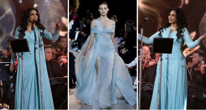 وارتدت ريا أبي راشد فستان طويل وبتصميم الكب من التل المطرز بألوان الأزرق والأخضر والذهبي والبنفسجي.