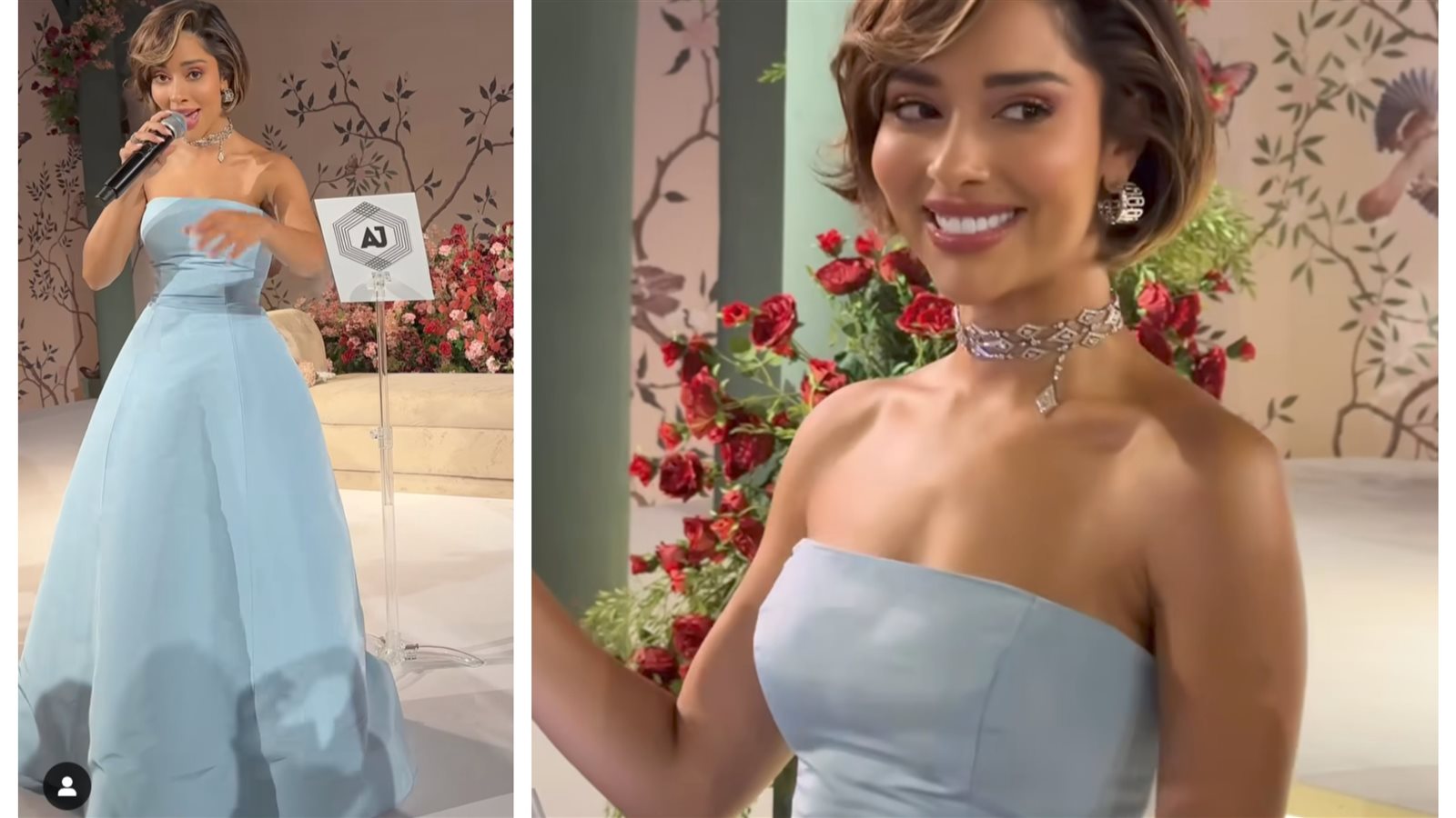 وأكملت إطلالتها ببعض الإكسسوارات الأنيقة، حيث ارتدت كولية وأقراطًا من الألماس باللونين الأخضر والفضي، بالإضافة إلى ساعة يد باللون الزيتي، ما أضاف لمسة راقية ومتناسبة مع إطلالتها المميزة.