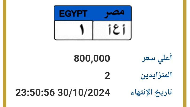 قدمت اللوحة المعدنية المميزة صاحبة الرقم 1، وتمتلك ثلاثة أحرف ق م ه، ووصل عدد المزايدين على اللوحة إلى 7 أشخاص، وبلغ سعرها في هذه اللحظة 950 ألف جنيه، وتنتهي عملية المزايدة غدًا يوم الثاني من نوفمبر في الساعة 14:16:28.