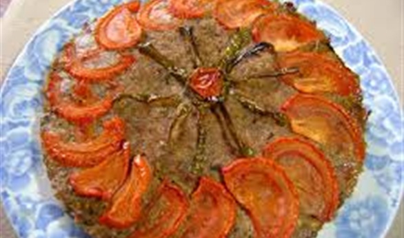 5- تغسل حبة الطماطم بالماء وتجف بورق المطبخ، ثم تقطع إلى شرائح نصفية رفيعة وتوزع على أطراف الكفتة.