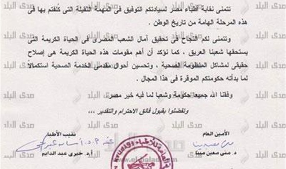حصل "صدى البلد" على نسخة من الخطابات والتى ارسلتها النقابة العامة للاطباء الى كل من رئيس الجمهورية، عبد الفتاح السيسي، ورئيس مجلس الوزراء، المهندس إبراهيم محلب، تعبر فيه عن خالص أمنياتها بالتوفيق خلال فترة ولايتهما لصالح الوطن وتحقيق آمال وطموحات الشعب المصري العظيم في حياة كريمة.