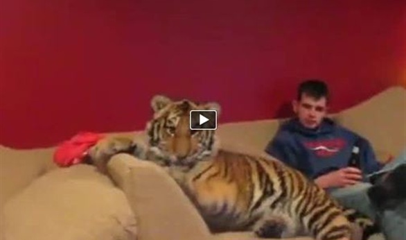 تداول النشطاء على موقعى "الفيس بوك وتويتر " فيديو لنمر يعيش مع صاحبه فى نفس المنزل ويتجول فيه بكل حرية ، ويقوم النمر والذى يظن نفسه قطه بمداعبه صاحبه والنوم على كتفه والمحاوله من الاكل مما ياكله والجلوس بجانبه ايضا دون ان يؤذى صاحبه .