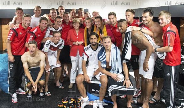 حرصت المستشارة الالمانية انجيلا ميركل علي تهنئة لاعبي منتخب بلادها شخصيا في غرفة الملابس بعد فوزهم الكاسح على البرتغال 4-صفر، في سالفادور دي باهيا، في الجولة الاولى من منافسات المجموعة السابعة لمونديال البرازيل 2014.