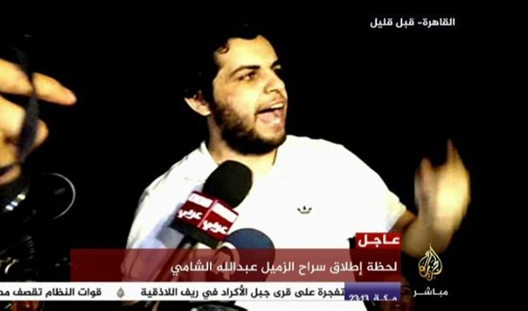 عرضت قناة الجزيرة مباشر لقطات للحظة خروج مراسلها بالقاهرة عبدالله الشامي من قسم أول مدينة نصر.