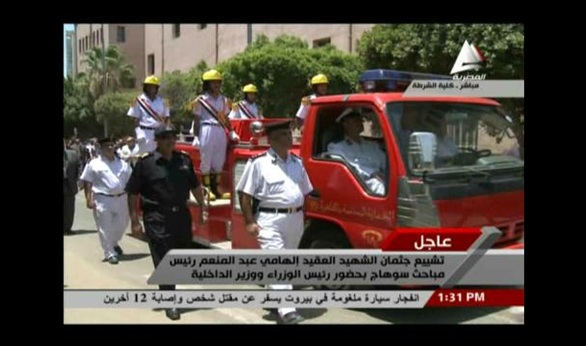 شيعت منذ قليل جنازة الشهيد العقيد إلهامي عبد المنعم، رئيس مباحث سوهاج، من مقر كلية الشرطة، بحضور رئيس الوزراء المهندس ابراهيم محلب ووزير الداخلية اللواء محمد ابراهيم، وعدد من الوزراء والمسئولين بالداخلية.