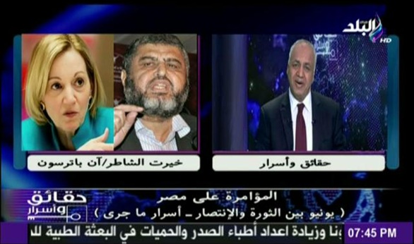 قال الإعلامي مصطفى بكري: إن السفيرة الأمريكية السابقة "آن باترسون"، ذهبت الي مكتب خيرت الشاطر، نائب مرشد جماعة الإخوان يوم 20 يونيو 2013؛ لاحتواء الأمر قبل 30 يونيو، ومحاولة تخفيف الضغط الشعبي، مضيفا أن السفيرة الأمريكية ذهبت الي الحاكم الحقيقي للبلاد، وليس الي الصورة التي وضعتها جماعة الإخوان، في إشارة الي الرئيس المعزول "مرسي".