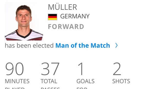 وتأهلت ألمانيا بصحبة أمريكا لدور ال16 بالمونديال ، واستند الفيفا في اختياره إلي أن مولر لعب 90 دقيقة كاملة وأهدى زملاءه 37 تمريرة صحيحة ومؤثرة ، وأحرز هدفا في المباراة وسدد تسديدتين مباشرتين علي مرمي المنافس.