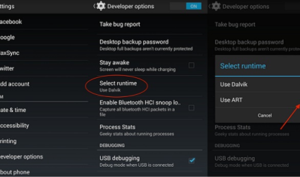 وعوضاً عن ذلك، بإمكان المستخدم الذهاب إلى قائمة "اعدادات" ثم اختيار "حول الهاتف"، ثم النقر على "إنشاء رقم" سبع مرات، من هنا يتم تفعيل خيارات المطورين، والتي تمنحه إمكانية الولوج إلى اعدادات متطورة أكثر، من قائمة الإعدادات المتطورة، يختار المستخدم "خيارات المطورين"، ثم اختيار "runtime"، ثم اختيار "ART" وبعد إعادة التشغيل، سيكون الجهاز مستعداً لتخصيص التطبيقات الخاصة بالمستخدم لعمل "runtime" جديد، لكن هذه الخطوة ستأخذ عدة دقائق، وعند الانتهاء تماماً سيلاحظ المستخدم تضاعف أداء الجهاز وجميع أجهزة أندرويد المقترنة به.