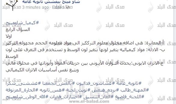 وبمجرد بدء الامتحان بدأت صفحة شاومينج بيغشش ثانوية عامة في نشر اجابات امتحان الكيمياء الذي يؤديه الطلاب داخل اللجان الان .