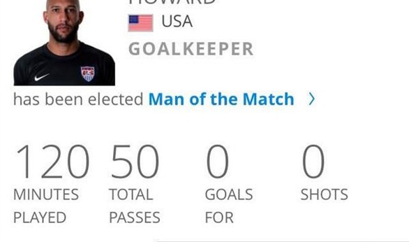 اختارت اللجنة الفنية بالاتحاد الدولي لكرة القدم حارس مرمي المنتخب الأمريكي تيم هاورد أفضل لاعب في مباراة بلجيكا وأمريكا بدور الـ16 لكأس العالم الذي يقام حالياً بالبرازيل، وتأهلت بلجيكا على حساب أمريكا لدور الـ8 بعد الفوز عليها 2-1 .