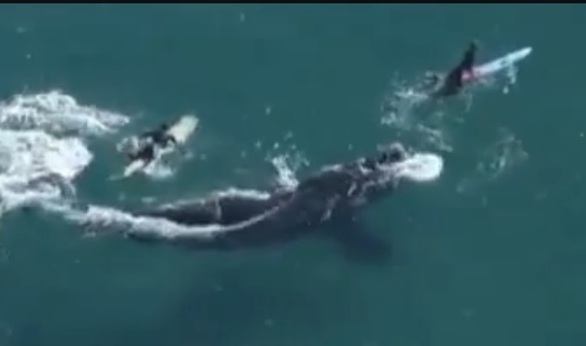 والجدير بالذكر ان حوت ضخم يسبح بهدوء وسط مجموعة من ركاب الموج دون أن يؤذيهم بشاطئ "فريشواتر" بمدينة سيدني.