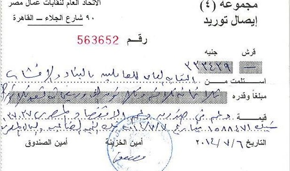 وينشر "صدي البلد" صورة ضوئية من تبرع النقابة العامة للبناء والأخشاب التي يرأسها عبد المنعم الجمل، لصالح صندوق دعم الاقتصاد رقم(37037) ، وذلك بمبلغ 333 ألفا و439 جنيها ، ورقم الشيك 1588471 بتاريخ 7 يوليو 2014 علي بنك التنمية الصناعية والعمل المصري.