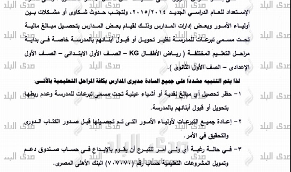 وجاء في نص هذا الكتاب الدوري: أنه لتجنب حدوث شكاوى أو مشكلات بين أولياء الأمور وبعض إدارات المدارس ، وذلك لقيام بعض المدارس بتحصيل مبالغ مالية تحت مسمى تبرعات للمدرسة نظير تحويل او قبول ابنائهم بالمدرسة خاصة في بداية مراحل التعليم المختلفة (رياض اطفال – الصف الاول الابتدائي – الصف الاول الاعدادي – الصف الاول الثانوي ) ، تقرر حظر تحصيل أي مبالغ مبالغ نقدية أو أشياء عينية تحت مسمى "تبرعات للمدرسة" ، وعدم ربطها بتحويل أو قبول ابنائهم بالمدرسة .