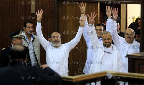 بديع وحجازي والبلتاجي يشيرون برابعة داخل القفص.. والدفاع ساخرا: "إحنا عايزين مترجم إشارات"