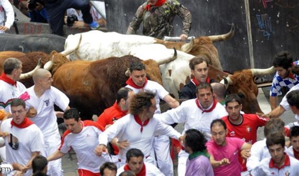 وأصيب عدد من الرجال بالفعل خلال مهرجان هذا العام لكن سباق يوم الاثنين وهو الثامن والأخير كان عنيفا بشكل خاص. فقد انشق احد الثيران على القطيع المكون من ستة ثيران وهاجم عددا من المتسابقين ورفع اثنين منهما على قرنيه وأصابهما بجروح في الساقين.