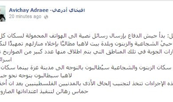 قال المتحدث باسم جيش الاحتلال الإسرائيلى، أن الجيش الاسرائيلي بدأ بإرسال رسائل نصية إلى الهواتف المحمولة لسكان كل من حييْ الشجاعية والزيتون وبلدة بيت لاهيا، مطالبًا بإخلاء منازلهم تمهيدًا لتكثيف الغارات الجوية في تلك المناطق التي يتم إطلاق منها عدد كبير من الصواريخ على إسرائيل.