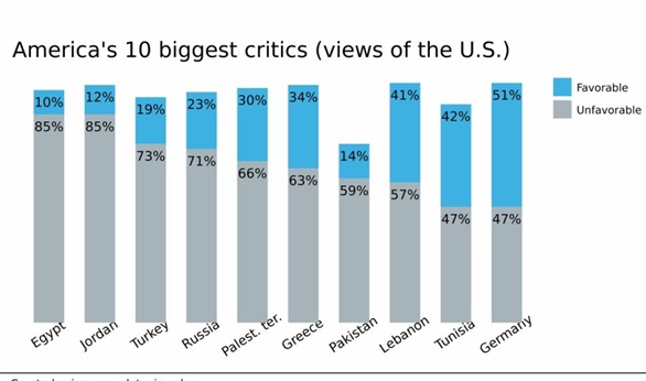 بينما سبب كراهية الأردن وتركيا وباكستان للولايات المتحدة فهي دعمها لإسرائيل ولـ"دورها" في العراق.