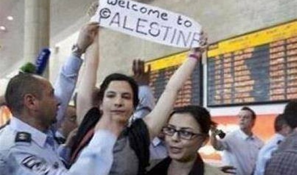 فتاة أمريكية تحمل لافتة "أهلا بكم فى فلسطين" فى مطار تل أبيب