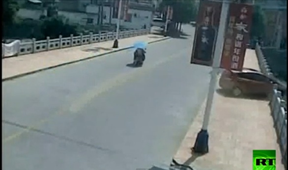 قاد سائق جديد سيارته أسفل جسر بعد أن خبط دواستي الفرملة والبنزين في شرق مقاطعة أنهوي الصينية.