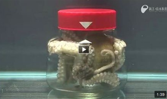 وفي هذا الفيديو إثبات لذكاء هذا الكائن، فبعد أن قام أحد الأشخاص بوضعه داخل علبة زجاجية محكمة الإغلاق، قام الأخطبوط بكل بساطة، بلف رأسه وجسده بطريقة مستمرة حتى تمكن من فتح العلبة والخروج وكأن شيئا لم يحدث.