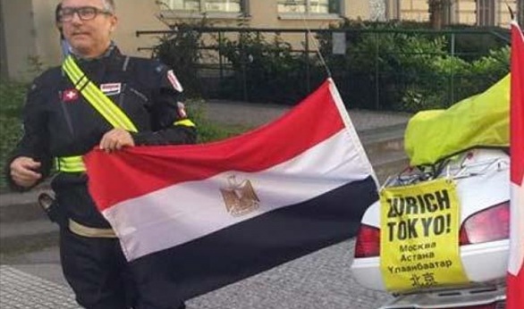 كان المغامر المصري انطلق من سويسرا إلى اليابان خلال رحلة برية تمتد من زيورخ إلى طوكيو رافعا العلم المصري، مستهدفا تحقيق رقما قياسيا عالميا في موسوعة "جينيس" العالمية.