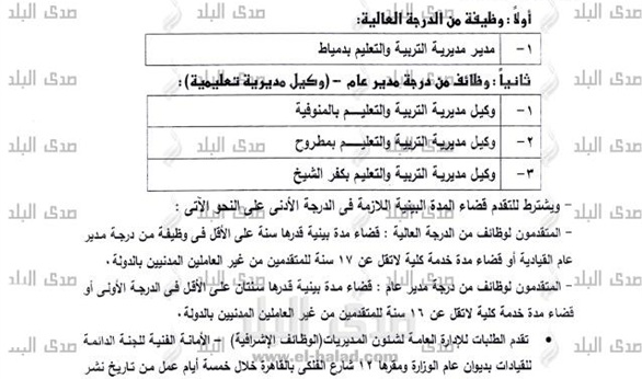 أعلنت وزارة التربية والتعليم عن حاجتها لشغل 4 وظائف قيادية، أولها وظيفة من الدرجة العالية وهي وظيفة مدير مديرية التربية والتعليم بدمياط، بالإضافة إلى 3 وظائف من درجة مدير عام وهي وظائف وكيل بمديريات التربية والتعليم الموجودة بالمنوفية ومطروح وكفر الشيخ.