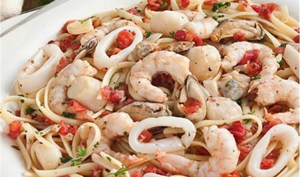 9-يرفع خليط المكرونة بالسى فود من على النار وتصب فى طبق التقديم ورشى عليه المتبقى من البقدونس