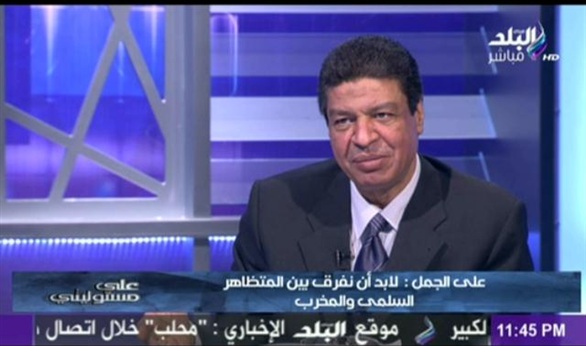 وأضاف "الجمل"، خلال حواره مع الإعلامي أحمد موسي، في برنامج "علي مسؤليتي"، المذاع علي فضائية "صدي البد"، انه "يحق للمواطن الخروج الي الشارع والأحتجاج علي السياسات التي تؤدي الي تدني مستوي معيشته وكذلك المطالبة بتحسين احواله ولكن بما لا يضر أمن الوطن ومنشآت الدولة".