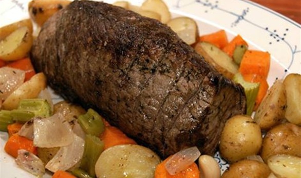 8- يقدم اللحم الروستو ساخناً أو بارداً مع الخضروات والأرز.
