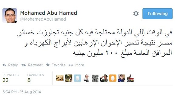 وقال "أبو حامد" فى تدوينة له عبر حسابه الرسمى على موقع التواصل الاجتماعى "تويتر": "في الوقت اللي الدولة محتاجة فيه كل جنيه تجاوزت خسائر مصر نتيجة تدمير الإخوان الإرهابين لأبراج الكهرباء والمرافق العامة مبلغ 200 مليون جنيه".