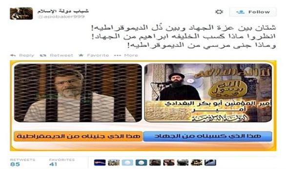 تداول أنصار تنظيم الدولة الإسلامية عبر موقع التواصل الاجتماعي تويتر، اليوم الأحد، صوراً للرئيس المصري الإخواني الأسبق محمد مرسي، في قفص الاتهام، وتحتها عبارة "هذا ما جنيناه من الديموقراطية"، في مقارنة مع صورة أبو بكر البغدادي التي كتب تحتها "هذا ما كسبناه من الجهاد".