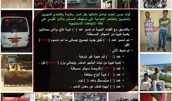 أعلن العميد محمد سمير المتحدث العسكرى للقوات المسلحة، عبر صفحته الرسمية بموقع التواصل الاجتماعى "فيس بوك"، ان قوات حرس الحدود نجحت بالتنسيق مع القوات الجوية فى مواصلة نشاطها بكل إصرار وعزيمة للتصدى للمهربين والمخربين والعناصر الإجرامية التي تستهدف المساس بالأمن القومى على كل الاتجاهات الاستراتيجية.