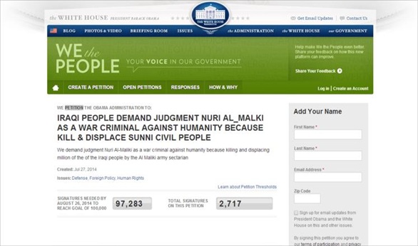 نشر البيت الأبيض على موقعه الإلكتروني أمس عريضة تلقتها ادارة الرئيس الأمريكي باراك أوباما من عراقيين يطالبون بمحاكمة رئيس الوزراء العراقي المنتهية ولايته نوري المالكي بوصفه مجرم حرب.