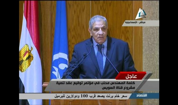 وأشاد محلب بالعمال في مشروع قناة السويس الجديدة، لأنهم استطاعوا أن يصلوا إلى مليون متر مكعب حفر في اليوم، وقال: "لدينا تحديات كبيرة ونعيش في ظروف صعبة وضاغطة، وحرب بين الخير والشر، لكن الإرادة والعزيمة على الانتصار قوية".