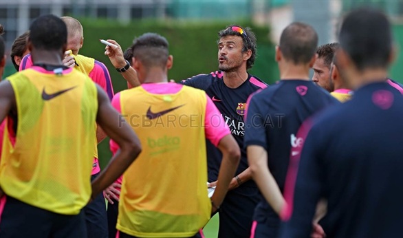 وقاد لويس أنريكي المدير الفني للفريق التدريبات التي شارك فيها 20 لاعبا بوجود تشافي ونيمار بعدما حصلوا على التصريح الطبي لخوض التدريبات الجماعية، بينما لم يشارك البرازيلي أدريانو سوى في جزء من المران، وادى تير شتيجن وفيرمايلين تدريبات علاجية خاصة بسبب إصابتهما.