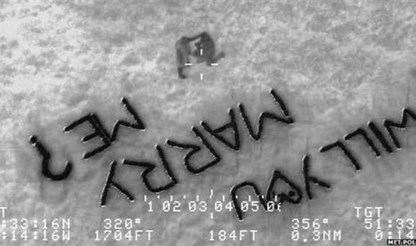 وسمحت خاصية التقاط الصور الحرارية، التي تتمتع بها كاميرات الشرطة، بالتقاط صورة الزوجين، بما في ذلك الرجل جالساً على ركبة واحدة (وهي الوضعية المعهودة عند التقدم للزواج).