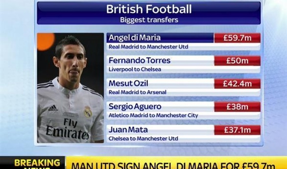 احتلت صفقة انتقال الأرجنتيني انخل دي ماريا من ريال مدريد لمانشستر يونايتد المركز الأول في الصفقات الأعلي والاغلي في تاريخ الدورى الإنجليزي.