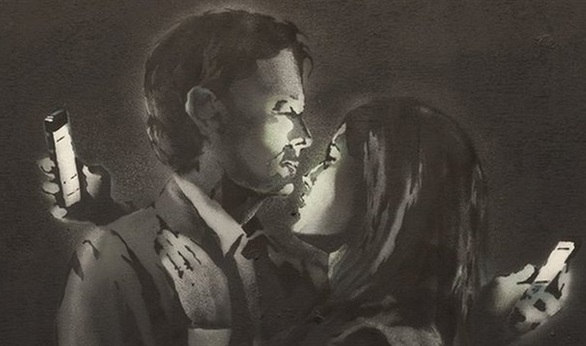 اللوحة تصور اثنين متشابكين بالأيدى بواسطة تليفون محمول ، وقد رسمت على لوحة خشبية ، وعلقت على جدار مبنى حتى يراها جمهور الشارع .