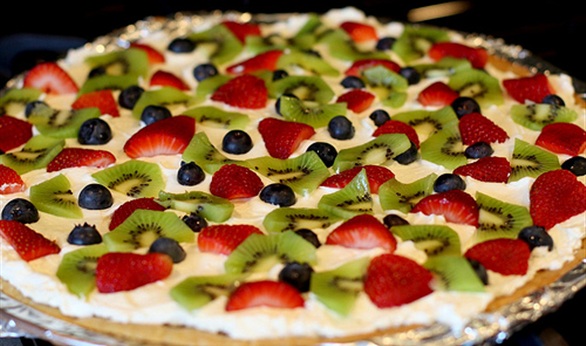 - يغطي سطح البيتزا بالكريمة وتزين بالفواكه، ثم تقدم باردة