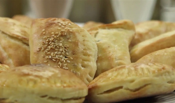 شكلى العجينة حسب كل حشوة وإدهنيها بالبيض و اللبن وميزى كل صنف برش الوجه بنوع من انواع ( حبة البركة - سمسم - جبن رومى).