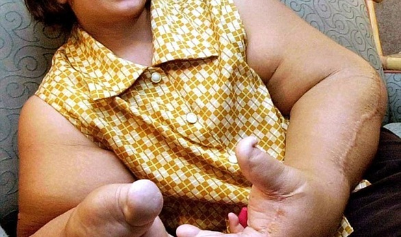 نشر موقع "ديلي ميل" البريطاني صورًا لصاحبة أكبر يد بالعالم وهي سيدة تايلاندية "59 عاما" وهذه السيدة تعاني من مرض نادر للغاية وهو نمو لا يتوقف أبدًا في الكتف إلى الأصابع ويترك الأطراف منتفخة .