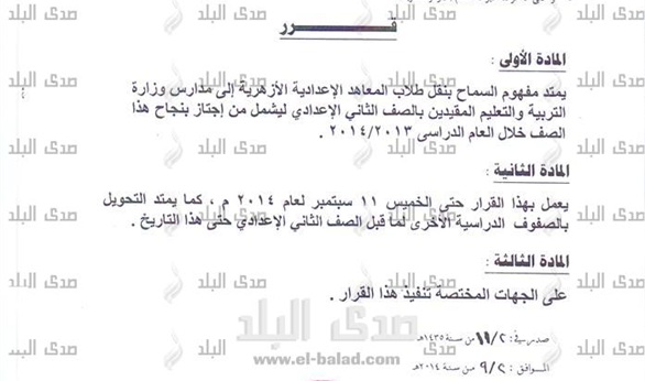 وكان الازهر قد أصدر قرارا منذ فترة وجيزة بمنع التحويل من المعاهد الأزهرية إلى التربية والتعليم لمن نجح فى الصف الثانى الإعدادى وما فوقه من الفصول الدراسية.
