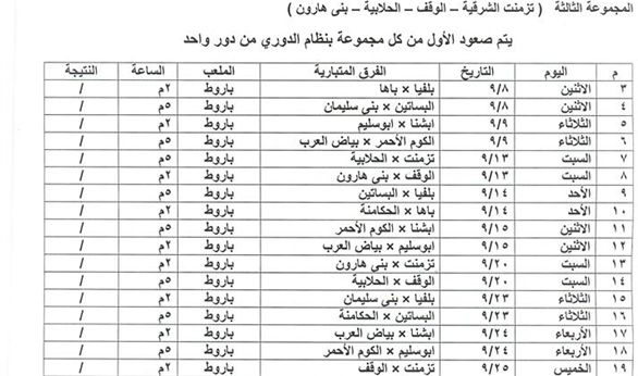 وقال إنه سيتم التصفية بينهم ليصعد 24 فريقا للمشاركة فى بطولة دوري مراكز الشباب على مستوي المحافظة، واليكم جداول التصفيات لمراكز الشباب المؤهلة لدوري مراكز الشباب التى سوف تبدأ الاثنين المقبل حسب الجداول التالية.