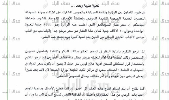 بالمستندات.. "الصيادلة" تطالب "الصحة" بإعادة النظر في تسعيرة عقار الالتهاب الكبدى