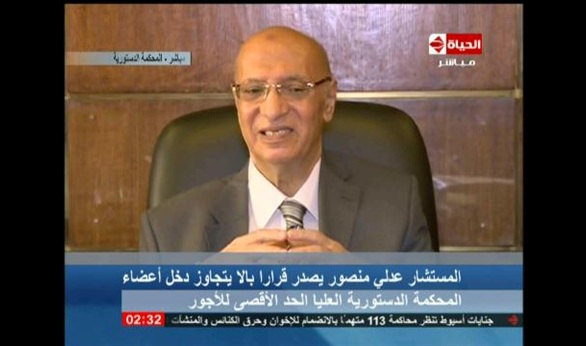 قال المستشار محمد الشناوي، نائب رئيس المحكمة الدستورية العليا والمتحدث الرسمي لها، إن قرار المستشار عدلي منصور بألا يتجاوز دخل أعضاء المحكمة الحد الأقصى للأجور، هو قرار حاسم ولا رجعة فيه، مشيرا إلى أنه لم يصل دخل أعضاء المحكمة الحد الأقصى المنصوص إليه.