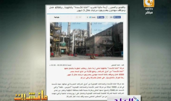أبرز برنامج "مانشيت" الذي يعرض علي قناة " ON Tv" تحقيقا خاصا قام به موقع "صدي البلد" الإخباري حول أزمة مالية تضرب "الدلتا للأسمدة" بالدقهلية.. و4500 عامل وموظف مهددون بعدم وجود مرتبات خلال 3 شهور.