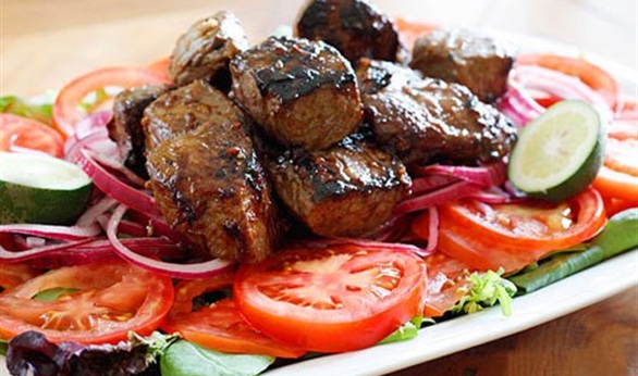 ٤ ـ سخني طاسه وضيفي 1/2 ملعقة كبيرة زيت ثم ضعي قطع اللحم وفلبيها على الجانبين واتركيها إلى أن تستوى وتقدم فوق السلطة المخلوطة بالصلصة